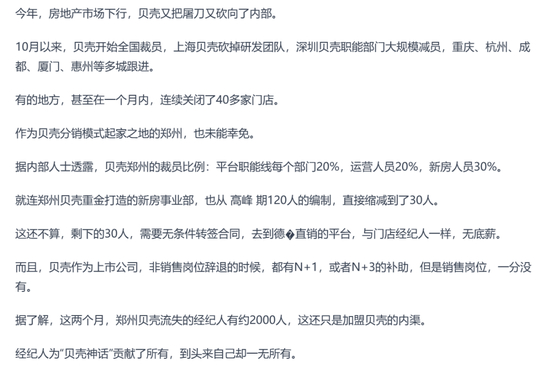 2022年,贝壳旗下的各大经纪门店开启了一轮超强力度的大裁员。