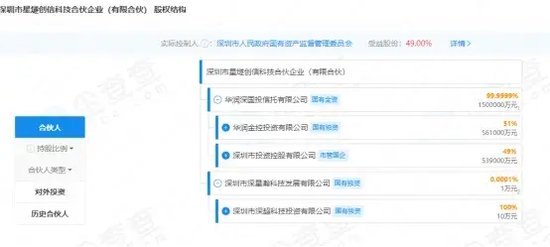 合伙人信息显示,华润深国投信托有限公司出资150亿元,出资占比99.9999%;深圳市深星瀚科技发展有限公司出资1万元,占比0.0001%。股权关系显示,华润深国投信托有限公司股东为华润金控和深圳市投资控股有限公司;深圳市深星瀚科技发展有限公司股东为深圳深超科技有限公司,穿透为深圳重大产业投资集团有限公司(以下简称“深重投”)。