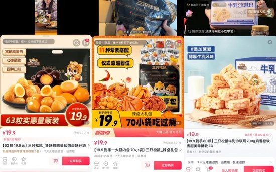 以夏威夷果为切口,三只松鼠打开了抖音渠道的运营思路。观察三只松鼠在抖音上的爆款产品不难发现,其寄希望于复制夏威夷果的成功,三只松鼠后续推出的多款产品都延续了19.9元量贩大包装、高性价比的形式,如19.9元70小袋的辣卤礼包,19.9元80根的沙琪玛,19.9元的量贩装每日坚果等。