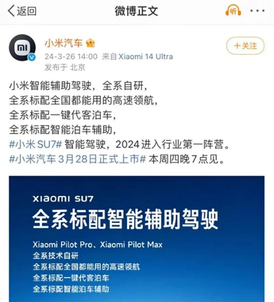 小米汽车在微博表示,“小米智能辅助驾驶,全系自研,全系标配全国都能用的高速领航,全系标配一键代客泊车,全系标配智能泊车辅助,#小米SU7#智能驾驶,2024进入行业第一阵营。”