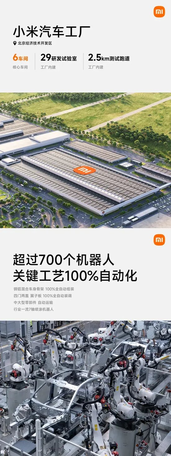 3月19日,小米汽车超级工厂正式揭幕,集研发、生产、测试于一体,设有6大核心车间、29个实验室,超过700个机器人,关键工艺实现了100%自动化,保证高品质高效交付。在这里,满产后每76秒就会有一台崭新小米SU7下线。