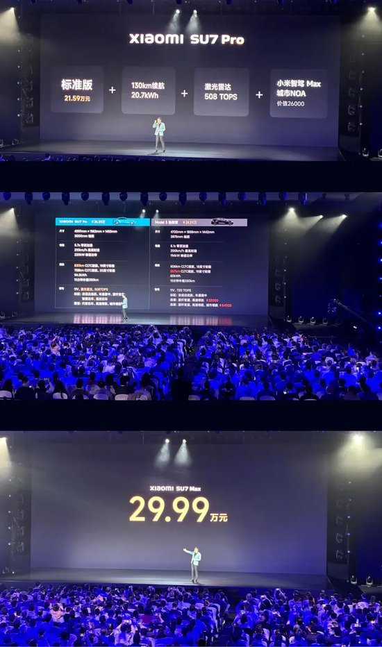 他同时强调,小米汽车SU7的标准版不是丐版,具备长续航和智驾功能。小米SU7标准版车价为21.59万元,车载冰箱、音响等免费送。另外,小米SU7 pro版的售价为24.59万元。“我们很多方面短时间追不上特斯拉,但我们也有科技狠活。”