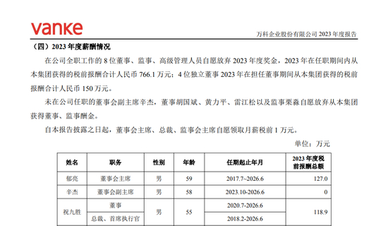 年报显示,2023年在万科集团全职工作的8位董事、监事、高级管理人员自愿放弃2023年度奖金;自年报披露之日起,董事会主席、总裁、监事会主席自愿领取月薪税前1万元。