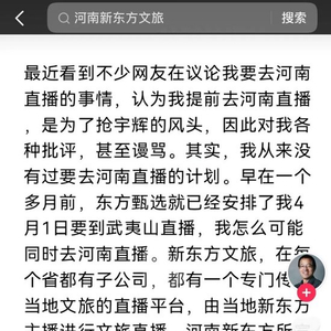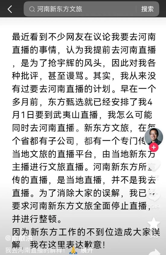 俞敏洪称,新东方文旅在每个省都有子公司,都有一个专门传播当地文旅的直播平台,由当地新东方主播进行文旅直播。河南新东方所宣传的直播,是当地直播,并不是他去直播。为消除大家的误解,他已要求河南新东方文旅全面停止直播,并进行整顿。他还为新东方工作不到位造成大家误会表达歉意。