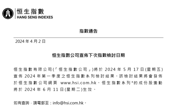4月2日,恒生指数有限公司发布《指数通告》称,公司将于5月17日(星期五)宣布2024年第一季度之恒生指数系列检讨结果。恒生指数系列的成份股变动将于6月11日(星期二)生效。