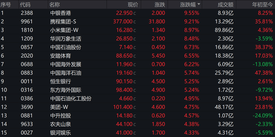 中银香港涨9.55%,携程集团涨9.21%,小米集团涨8.97%,领涨蓝筹。