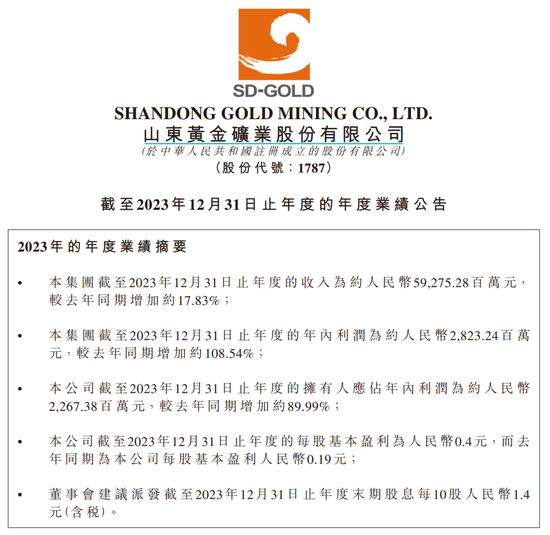 山东黄金于3月28日公布2023年业绩,2023年公司实现营收592.75亿元,同比增长17.83%,归母净利润23.28亿元,同比增长86.57%,扣非归母净利润22.13亿元,同比增长69.47%。