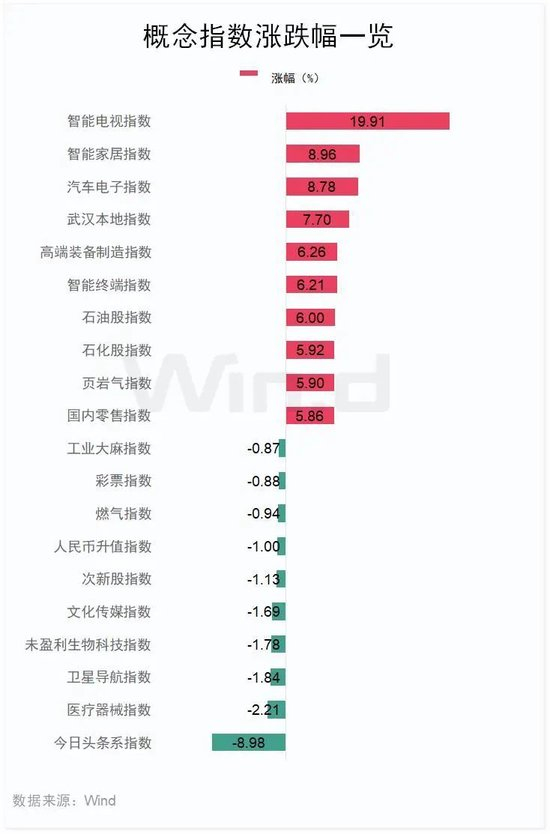 从盘面来看,Wind概念板块多数上涨,智能电视指数涨19.91%,智能家居指数涨8.96%,汽车电子指数涨8.78%。跌幅方面,今日头条系指数领跌8.98%,医疗器械指数跌2.21%,卫星导航指数跌1.84%。