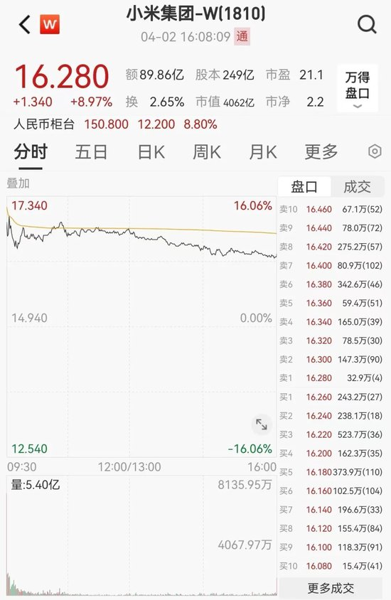 新车热卖,令小米集团放量大涨,一度飙升16.06%至17.34港元,随后涨幅收窄,全天收于16.28港元,涨8.80%,成交额达89.86亿港元。