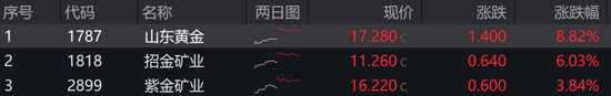 受金价屡创新高带动,黄金股全线大涨。山东黄金涨8.82%,招金矿业涨6.03%,紫金矿业涨3.84%。