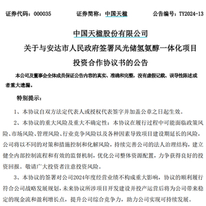 公告显示,中国天楹全资子公司安达市天楹新能源有限公司(以下简称“安达天楹”)与黑龙江省安达市人民政府经友好协商,共同签署《风光储氢氨醇一体化项目投资合作协议书》。