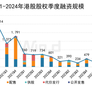 Wind数据统计显示,2024年一季度港股一级市场股权融资(包含IPO与再融资)金额为255亿港元,较去年同期融资金额321亿港元减少20.55%。2024年一季度共有12家企业在主板成功IPO上市(未包含GEM转主板上市企业),较去年同期的18家减少33.33%;IPO募集金额为46亿港元,较去年同期的67亿港元减少31.17%。最大IPO项目为速腾聚创(2498.HK)募资金额为10.59亿港元。2024年一季度再融资金额合计209亿港元,较去年同期下降17.77%。最大的再融资项目为阿里健康(0241.HK),募集金额为115.12亿港元。