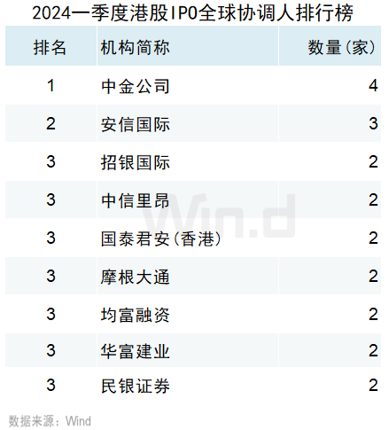 中金公司以全球协调人身份参与了4家IPO,位居全球协调人排行榜第一位;安信国际参与了3家IPO,位居第二位。