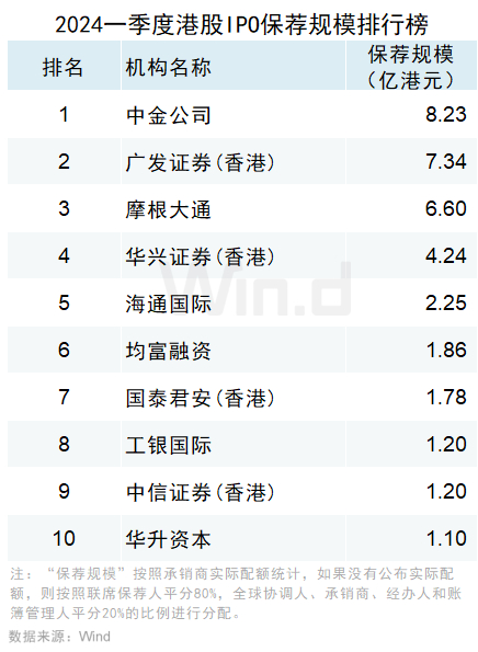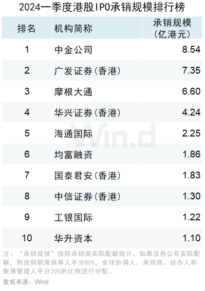 2024年一季度港股承销排行榜 中金承销金额约8.23亿港元位居榜首