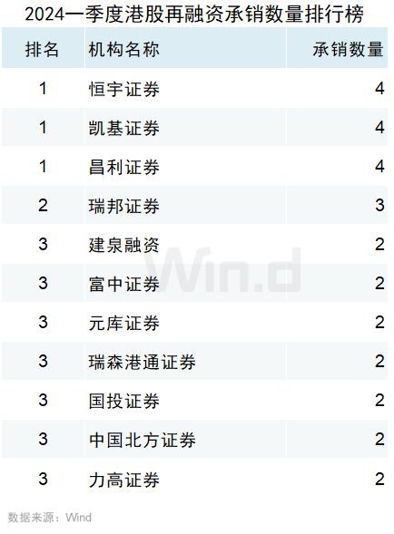 恒宇证券、凯基证券和昌利证券以承销商身份各参与了4起再融资事件,并列第一名。