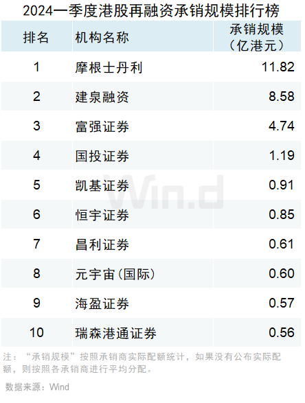 摩根士丹利以11.82亿港元的再融资承销规模位列第一,承销数量1起;建泉融资以8.58亿港元的承销规模位列第二,承销数量2起;富强证券以4.74亿港元的承销规模位列第三,承销数量1起。