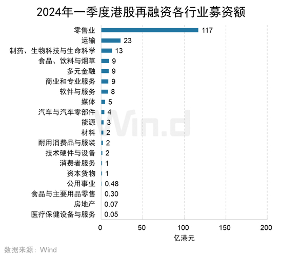 从各行业融资金额来看,零售业为唯一一个募资超百亿的行业,募资金额为117亿港元。