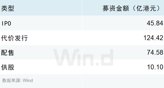 从具体融资方式来看,2024年一季度IPO募资金额为45.84亿港元,占总募集资金的17.98%;代价发行募集金额为124.42亿港元,是份额最大的融资方式,占比达48.80%;配售募集金额为74.58亿港元,占比达29.26%;供股募资金额为10.10亿港元,占比达3.96%。