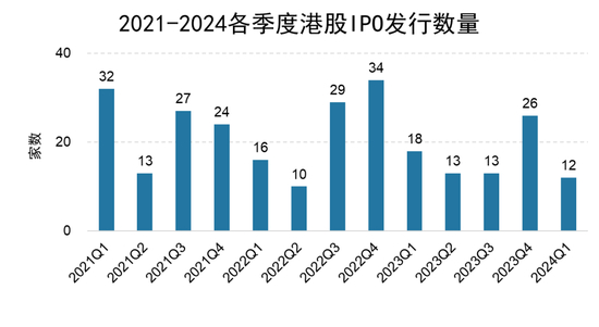 2024年一季度港股IPO发行数量为12家,较去年同期的18家减少33.33%。