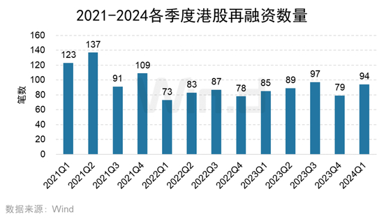 2024年一季度,再融资募集总额为209亿港元,较去年同期的254亿港元减少17.77%。再融资项目数量为94起,较去年同期的85起增长10.59%。