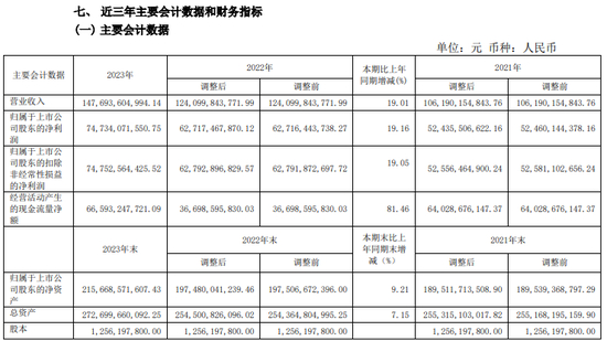 年报数据显示,2023年全年,贵州茅台实现营业收入1476.9亿元,同比增19.01%;实现归母净利润747.3亿元,同比增19.16%;实现扣非归母净利润747.5亿元,同比增19.05%。