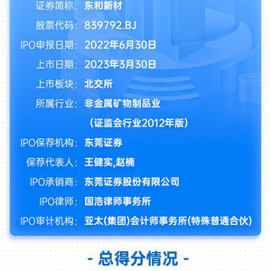 东和新材IPO项目总得分为70.5分,分类C级。影响东和新材评分的负面因素是:公司信披质量有待提高,发行费用率较高,属于多次申报,上市首日股价较发行价格破发,上市三个月股价较发行价格下跌,实际募资金额缩水,上市后第一个会计年度公司营业收入、归母净利润、扣非归母净利润下滑。这综合表明,公司短期内盈利能力有待提高,信披质量有待提高,建议投资者关注其业绩表现背后的真实性。