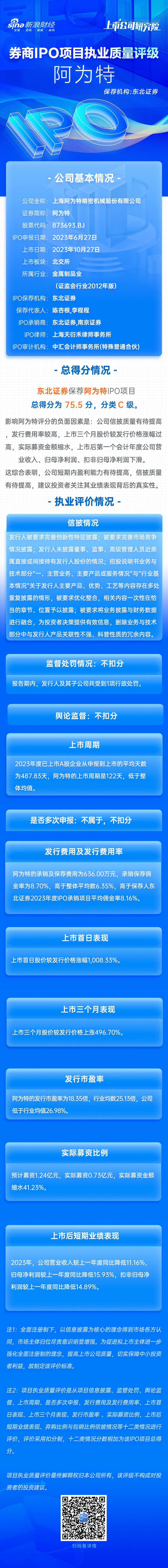 阿为特IPO项目总得分为75.5分,分类C级。影响阿为特评分的负面因素是:公司信披质量有待提高,发行费用率较高,上市三个月股价较发行价格涨幅过高,实际募资金额缩水,上市后第一个会计年度公司营业收入、归母净利润、扣非归母净利润下滑。这综合表明,公司短期内盈利能力有待提高,信披质量有待提高,建议投资者关注其业绩表现背后的真实性。