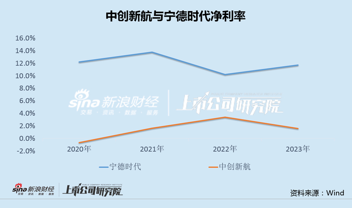 事实上,营收增长的同时,中创新航的毛利率也从2022年的10.32%上升至2023年的13.00%,但净利率却从3.40%下滑到仅1.62%,走势同样与宁德时代相背离。