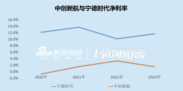 事实上,营收增长的同时,中创新航的毛利率也从2022年的10.32%上升至2023年的13.00%,但净利率却从3.40%下滑到仅1.62%,走势同样与宁德时代相背离。