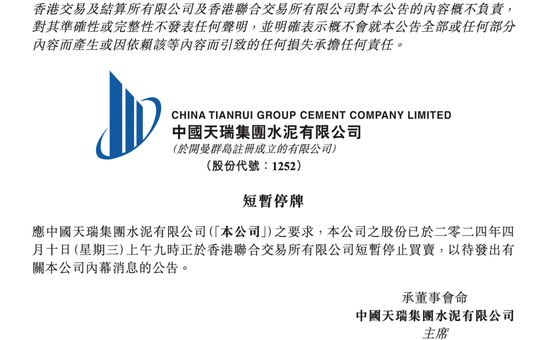 4月10日早间,中国天瑞水泥在港交所紧急公告,将于当天上午九时正起短暂停止买卖,以待发出有关公司内幕消息的公告。