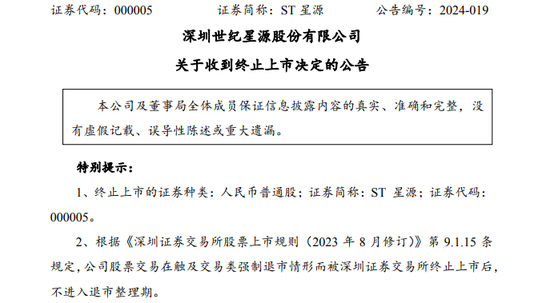 在停牌逾一月后,ST星源等来终止上市的决定。ST星源公告,公司于2024年4月11日收到深交所出具的《关于深圳世纪星源股份有限公司股票终止上市的决定》,深交所决定终止公司股票上市。