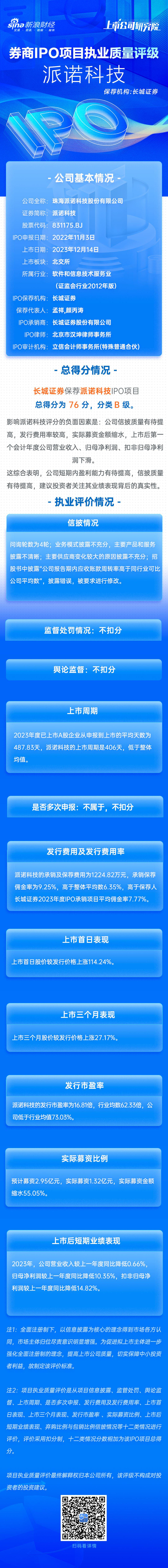 派诺科技IPO项目总得分为76分,分类C级。影响派诺科技评分的负面因素是:公司信披质量有待提高,发行费用率较高,实际募资金额缩水,上市后第一个会计年度公司营业收入、归母净利润、扣非归母净利润下滑。这综合表明,公司短期内盈利能力有待提高,信披质量有待提高,建议投资者关注其业绩表现背后的真实性。