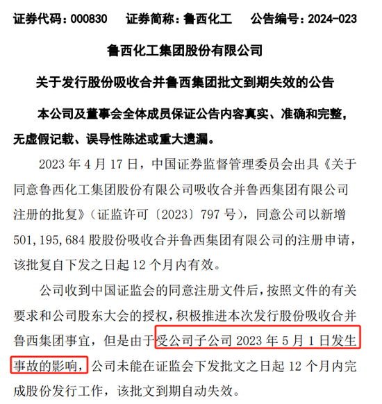 同时,鲁西化工吸收合并其控股股东鲁西集团有限公司(简称“鲁西集团”),以实现整体上市的计划,在获得中国证监会批复后,受事故影响未能在批文下发之日起12个月内完成股份发行工作。该批文到期自动失效。