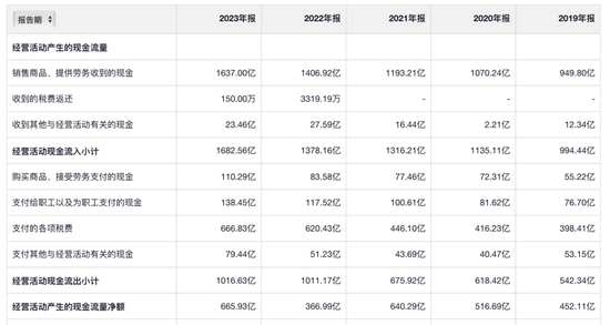 那么茅台净现比为何小于1?答案是税费。白酒是高税费商品,除了增值税、所得税,还需缴纳巨额消费税。2023年年报的合并现金流量表显示,贵州茅台现金支出的各项税费,高达666.8亿元,其中消费税176.3亿元。