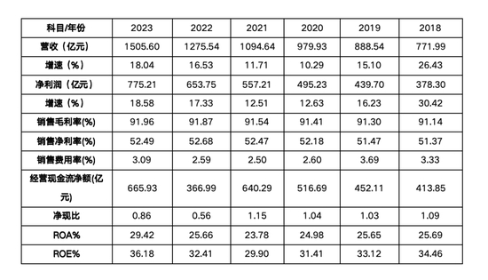 表1显示,2023年度,贵州茅台营收和净利润,继续保持两位数增长:营收1505.6亿元,净利润775.2亿元,增速全部超过18%,均是2019年以来的增速最高值。
