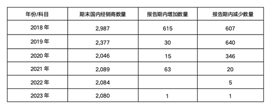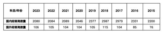表8可以看出,传统的国内经销商,从2018年的近3000个,锐减到2023年的2080个。而在数量高峰期的2018年,增减数量都超过600个,可谓“大换血”。