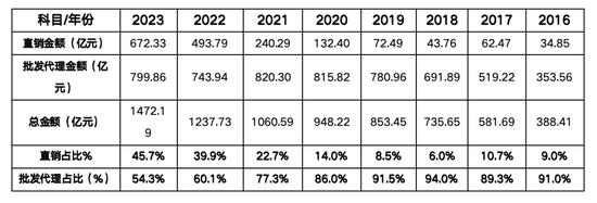 从截图4可以看出,2023年直销收入为672亿元,批发代理为800亿元,直销占比为45.7%,几乎平分秋色。