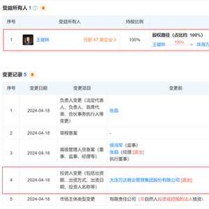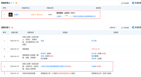 天眼查显示,近日,珠海万达锐驰企业管理有限公司(以下简称:珠海万达锐驰)发生工商变更,原全资股东大连万达商业管理集团股份有限公司(以下简称“大连万达商管集团”)退出,新增王健林为全资股东。