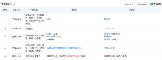 值得一提的是,就在太盟投资集团和大连万达商管签署了投资框架协议之后,大连万达商管又出资成立了大连万达锐驰企业管理有限公司(简称:大连万达锐驰),法定代表人为张晶。不过就在今年3月,张晶也卸任了大连万达锐驰的法人代表,由吴华接任,依旧是大连万达商管100%持股。