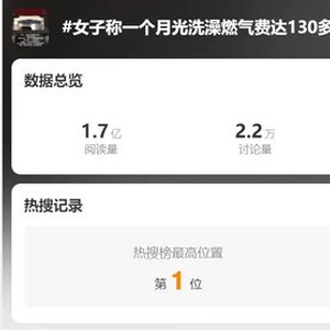 关于南京燃气费用暴增的话题,在网上连续多日引发热议,“女子称一个月光洗澡燃气费达130多元”的话题一度登上微博热搜榜第一位,阅读量达到1.7亿次。