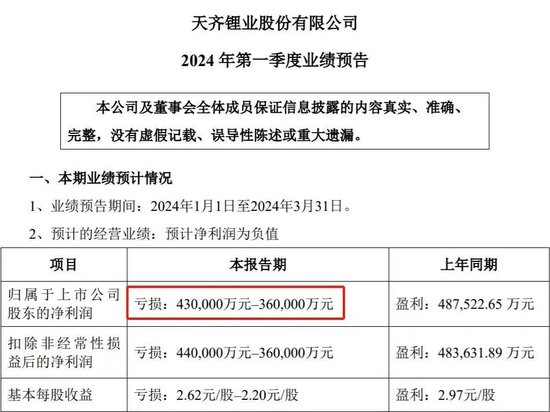23日晚,天齐锂业公告,预计一季度归属于上市公司股东净亏损43亿元-36亿元,上年同期为盈利48.75亿元。这您受得了吗?