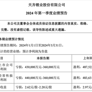 4月23日晚间,天齐锂业披露2024年第一季度业绩预告,预计今年第一季度净亏损36亿元—43亿元,而去年同期净利润48.75亿元,同比下降超过173.85%。