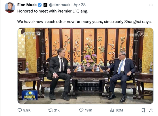 虽然只在北京呆了一天,马斯克此行却收获颇丰。马斯克在X(前推特)平台上写道,“很荣幸与李总理见面,从上海初见至今,我们已经相识多年。”或许,想起上海超级工厂项目,马斯克就心情大好。