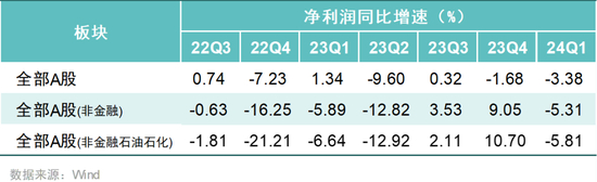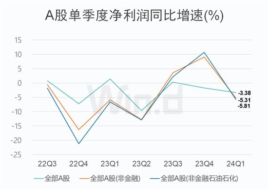 归母净利润方面,2024年一季度,A股净利润同比下降3.38%;剔除金融石油石化后,同比增速依次为A股非金融(-5.31%)、A股非金融石油石化(-5.81%)。