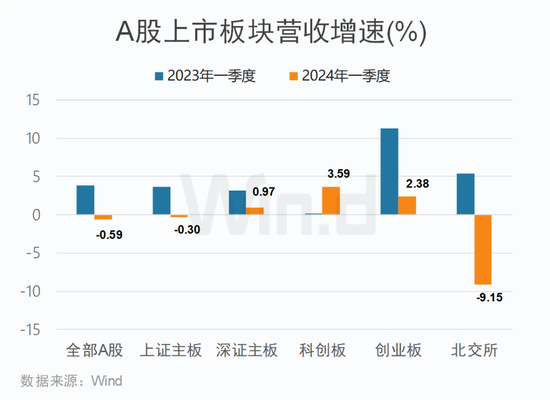 从板块来看,2024年一季度,深证主板、科创板和创业板营收同比实现增长,分别为0.97%、3.59%和2.38%,上证主板和北交所分别为-0.3%和-9.15%。