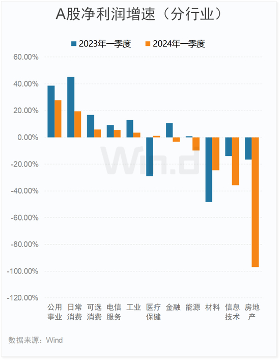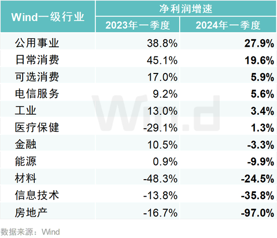 从行业来看,公用事业、日常消费以及可选消费领域上市公司业绩增速相对较高,房地产、信息技术、材料等5大行业净利润增长率为负。