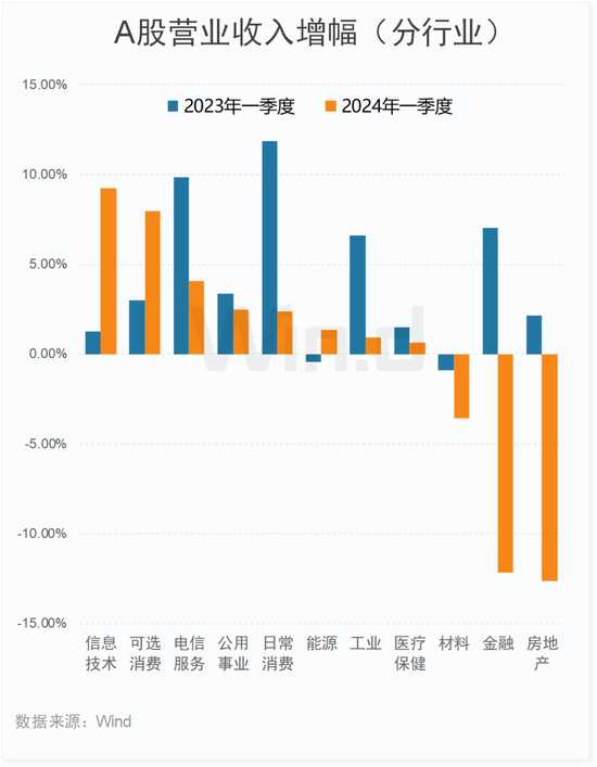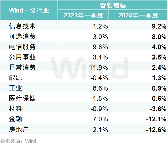 11个Wind一级行业中,有8个行业2024年一季度营业收入实现同比增长,其中信息技术、可选消费和电信服务3大行业营收同比增幅居前,均超过4%。
