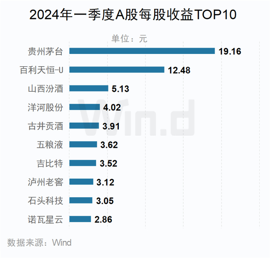 每股盈利方面,一季度贵州茅台以19.16元的每股收益稳居榜首。