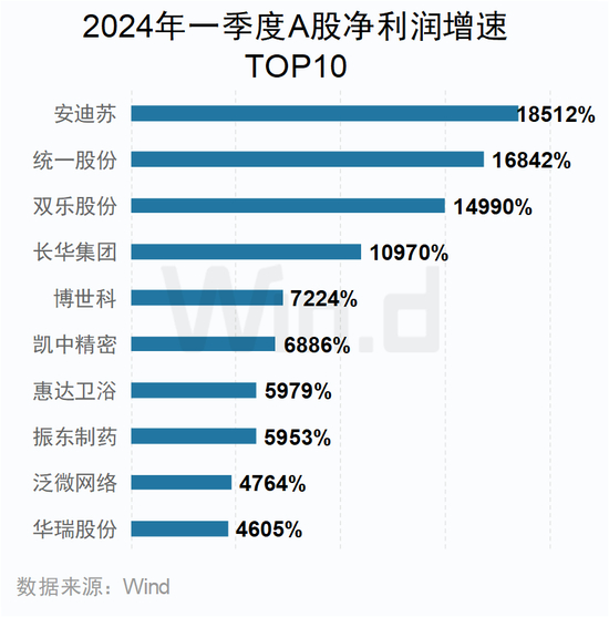 一季度,净利润增长率居前的A股公司大多来自工业和消费等行业。其中业绩增速最高的是安迪苏,净利润同比增幅超过185倍。