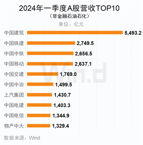 一季度,“两桶油”营收规模均超7000亿元,稳居前二。剔除金融及石油石化企业后,中国建筑以超5000亿的营收位居第一。